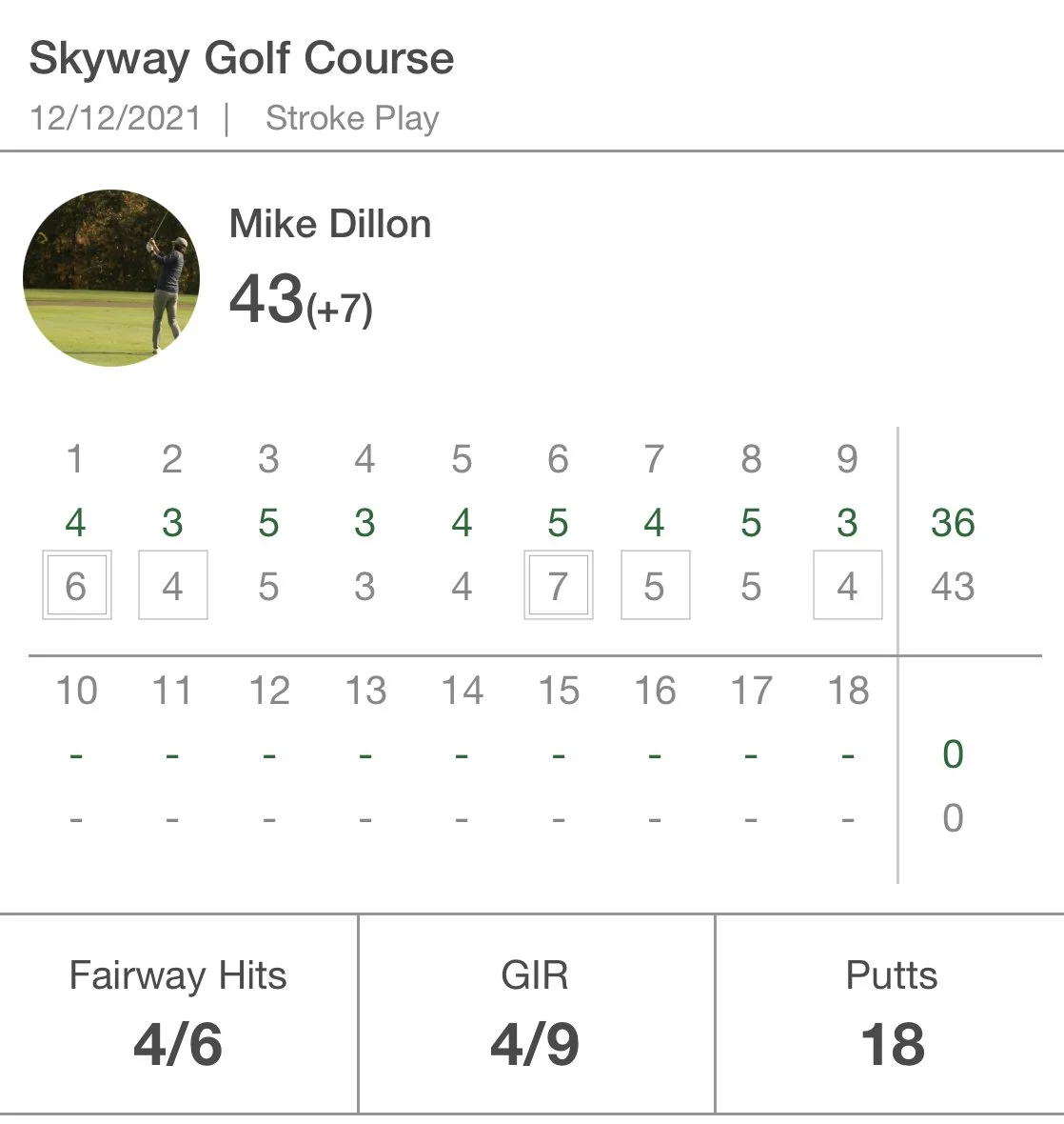I got off to a rough start on 1 - after blading my second shot over the green into a hazard, I failed to get up and down for bogey and dropped two strokes right off the bat. I settled down with 3 straight pars from holes 3-5 and then played bogey golf the rest of the way in to finish with a 43.