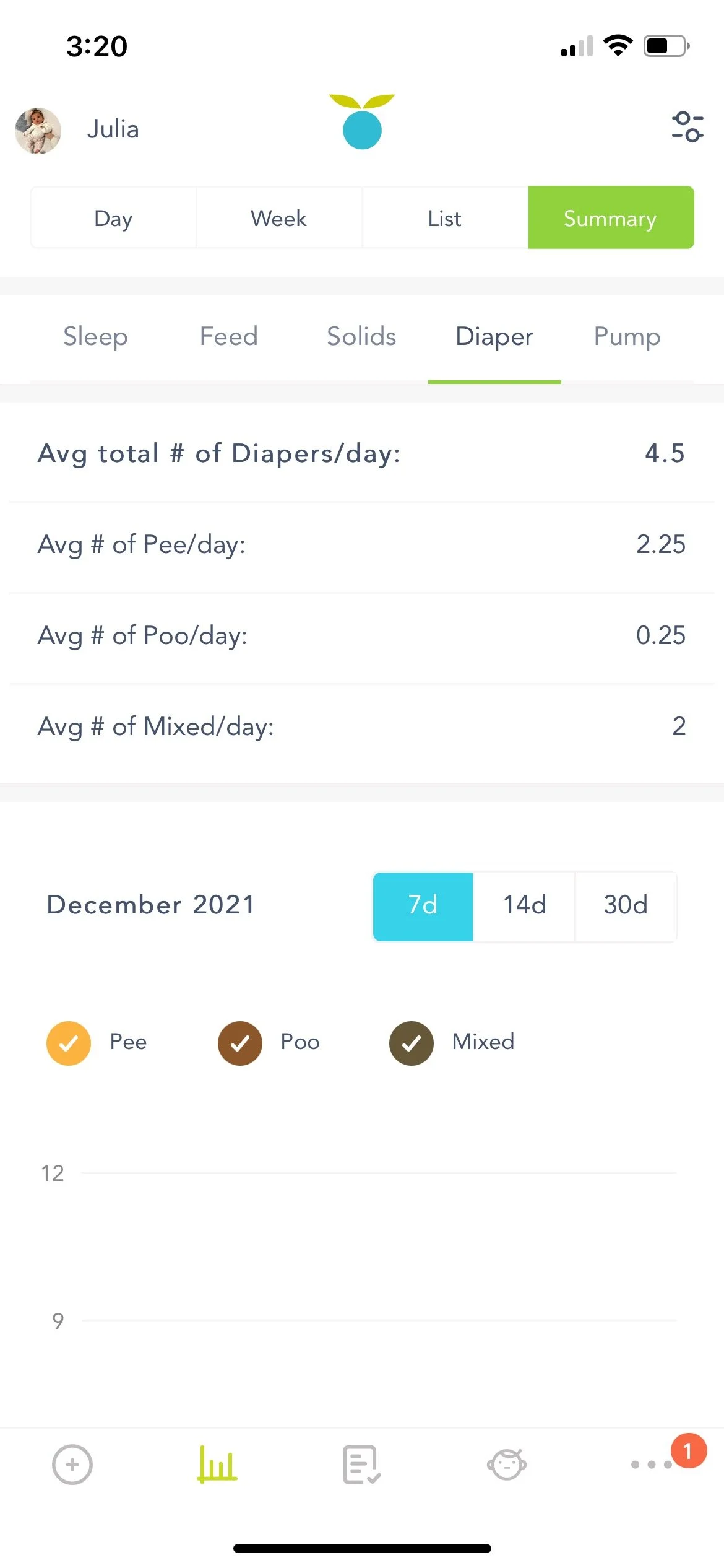 Julia averaging only 4.5 diapers a day - alarming considering this comes on an extended home stretch. Will be interesting to see if her production drops when she goes on the road…