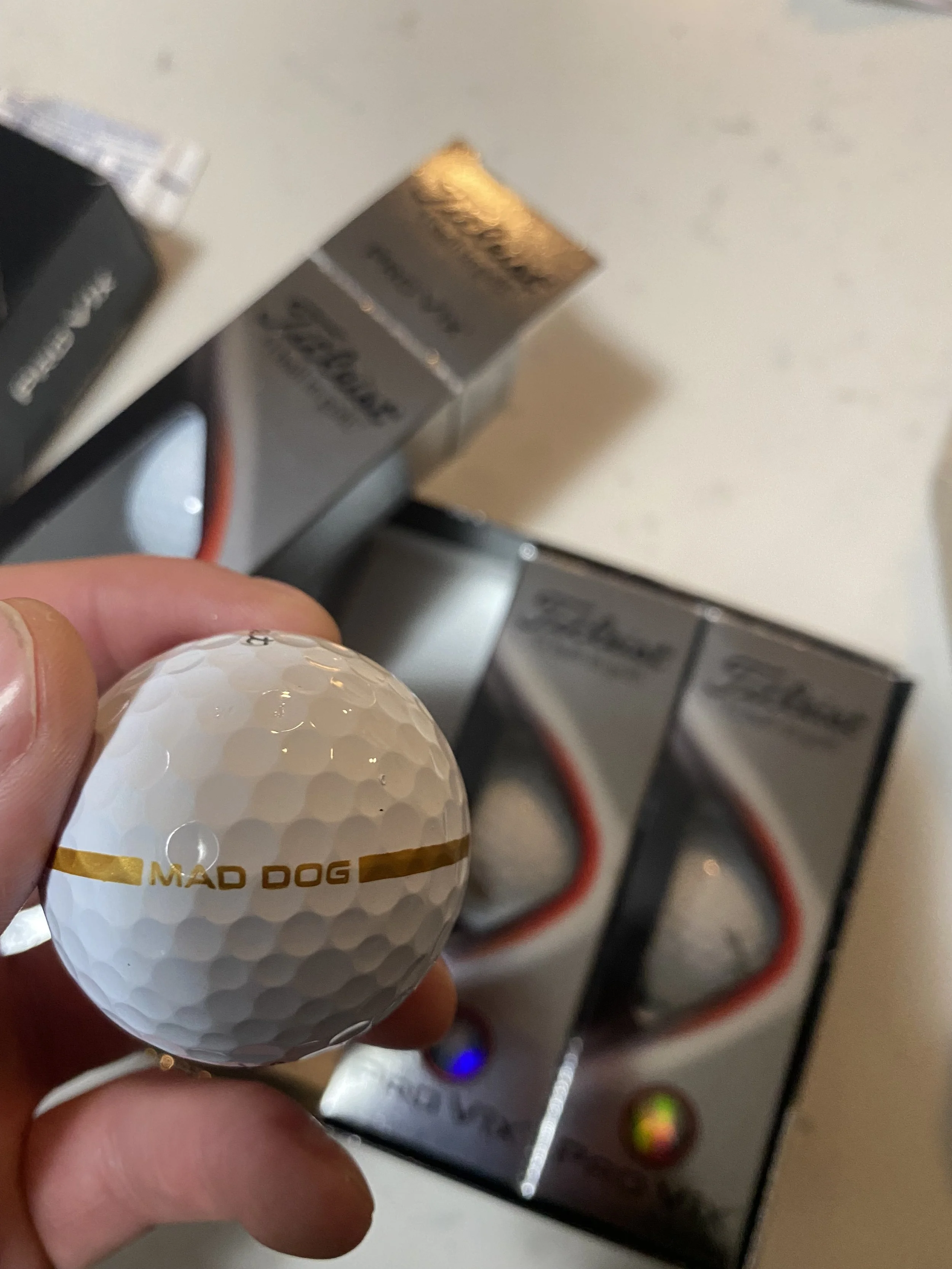 I stocked up on some ProV1s as well. Golfballs.com usually has some good deals with free personalization, and I really like the “align” option. Its a solid line that bisects the ball, in order to help line up putts; in this case, you can get a monogram within the line. Honestly, no idea why I did this, but I decided to get them personalized with “Mad Dog”