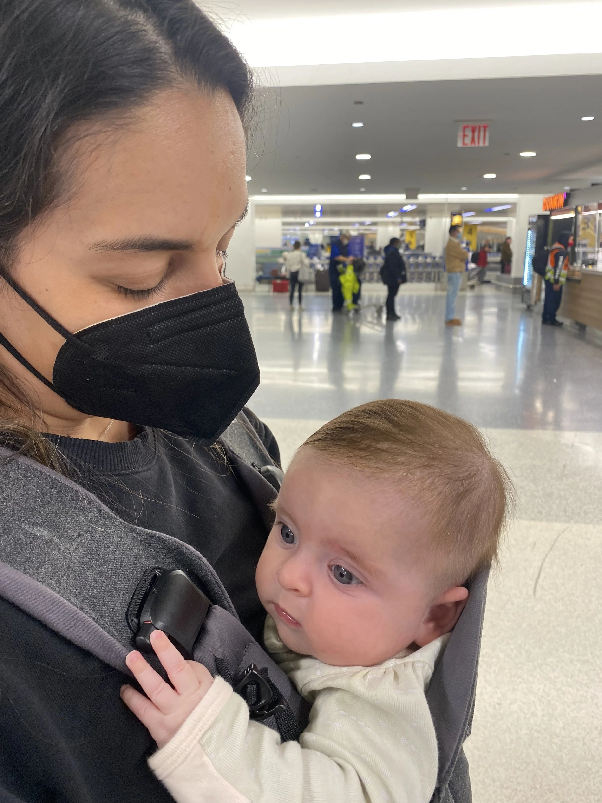 3:15 PM: We arrive to Denver International Airport for our 5pm scheduled flight and say bye to Liz. Loral puts Julia in the baby carrier (the one that straps to her chest) and we check our bags - the car seat and the travel stroller.
